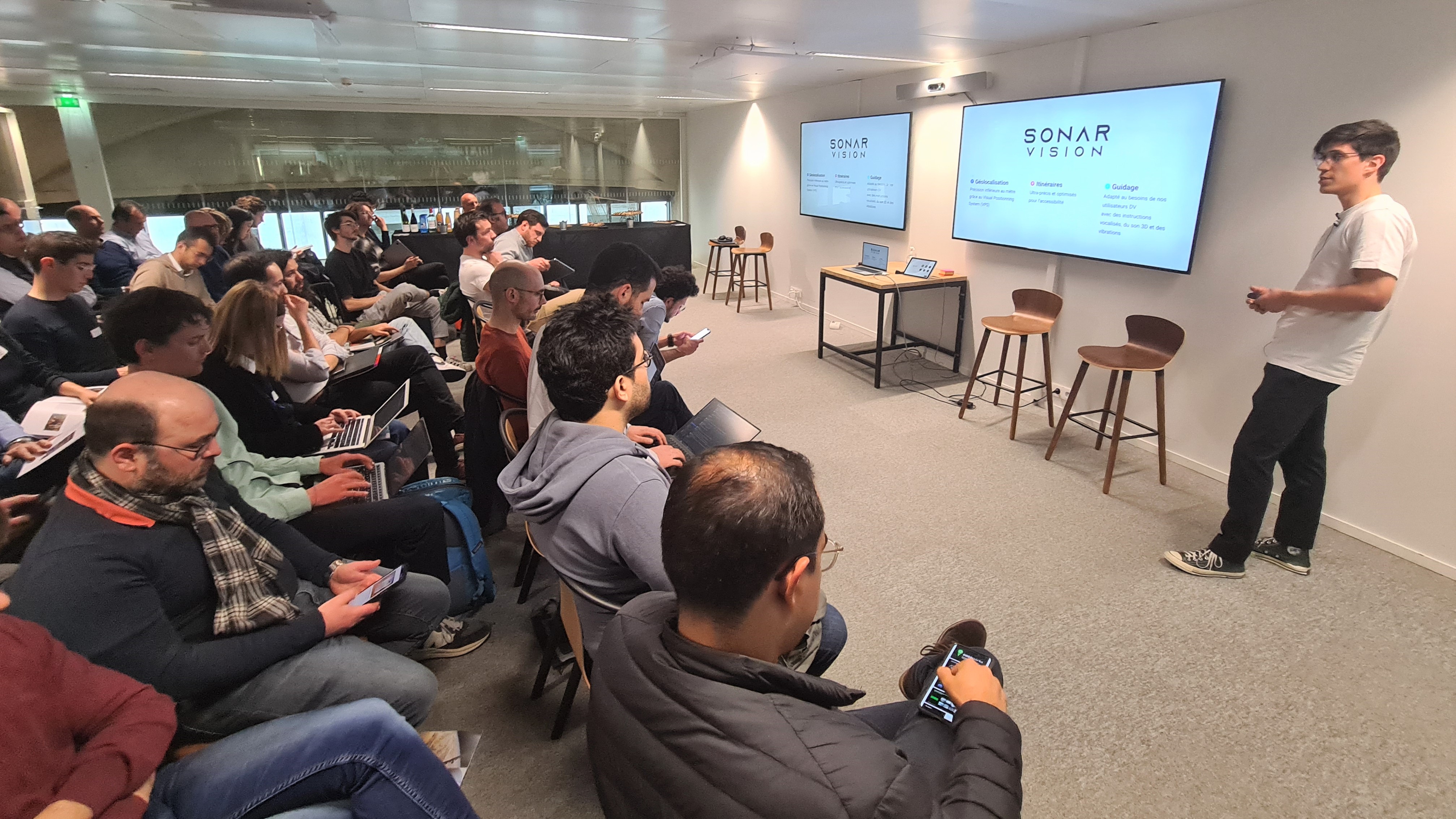 SonarVision développe une application iOS permettant aux personnes déficientes visuelles de se déplacer de manière indépendante. Grâce à cette app de réalité augmentée qui perçoit et comprend l’environnement, l’utilisateur suit un guide virtuel grâce à du son 3D et des vibrations.