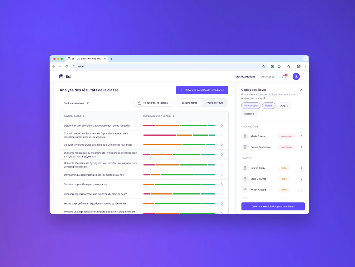 Ed.ai propose une correction augmentĂ©e par lâIA qui divise par deux Ă trois le temps de correction, tout en produisant des retours dĂ©taillĂ©s et justifiĂ©s. Chaque copie corrigĂ©e devient un diagnostic instantanĂ© : lâenseignant visualise immĂ©diatement les acquis et les lacunes, puis gĂ©nĂšre en quelques minutes des activitĂ©s de remĂ©diation personnalisĂ©es, construites Ă partir des erreurs rĂ©elles des Ă©lĂšves.